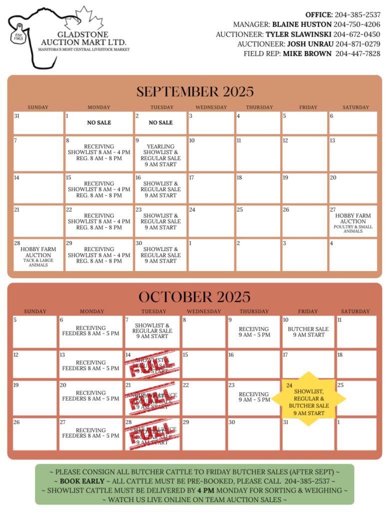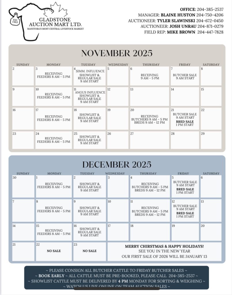 *ALL CATTLE MUST BE PRE-CONSIGNED, CALL THE OFFICE 204-385-2537*